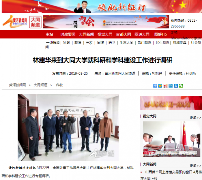 黄河新闻网大同讯 3月22日,全国外事工作委员会副主任林建华来到大同大学,就科研和学科建设工作进行专题调研。