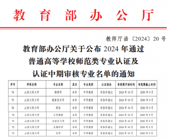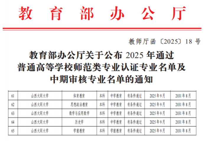 近日,教育部办公厅公布了2025年通过普通高等学校师范类专业认证专业名单,我校思想政治教育、数学与应用数学、历史学、体育教育和学前教育5个专业通过了国家第二级认证,认证结论均为有条件通过。这是继2024年我校汉语言文学等7个师范专业顺利通过教育部师范类专业认证后传来的又一大喜讯,标志着我校在师范教育方面取得了历史性突破。2025年11月,我校心理学专业将迎来专家组进校考查,师范类专业认证将实现全覆盖。