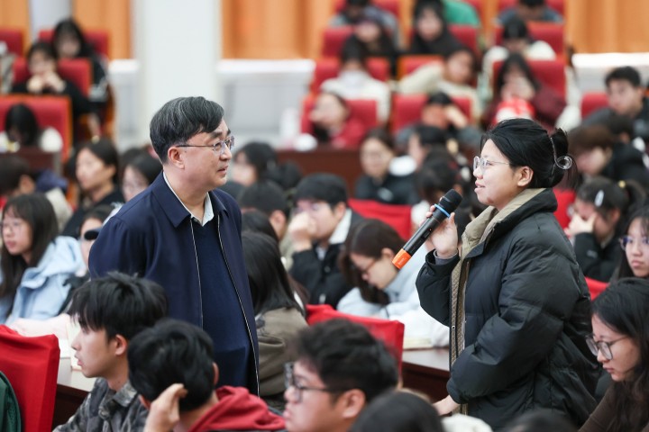讲授过程中,赵水民紧密结合国家发展大势、山西省转型发展布局以及我校办学特色和发展实际进行阐述,不时与现场师生互动交流,解答疑问,现场气氛活跃。最后,赵水民对广大青年学生提出希望,勉励同学们努力成长为德智体美劳全面发展的社会主义建设者和接班人,在全面推进中国式现代化的伟大征程中贡献青春力量,书写无愧于时代的壮丽篇章。(文字:马克思主义学院 摄影:余致楠 责编:赵鑫)